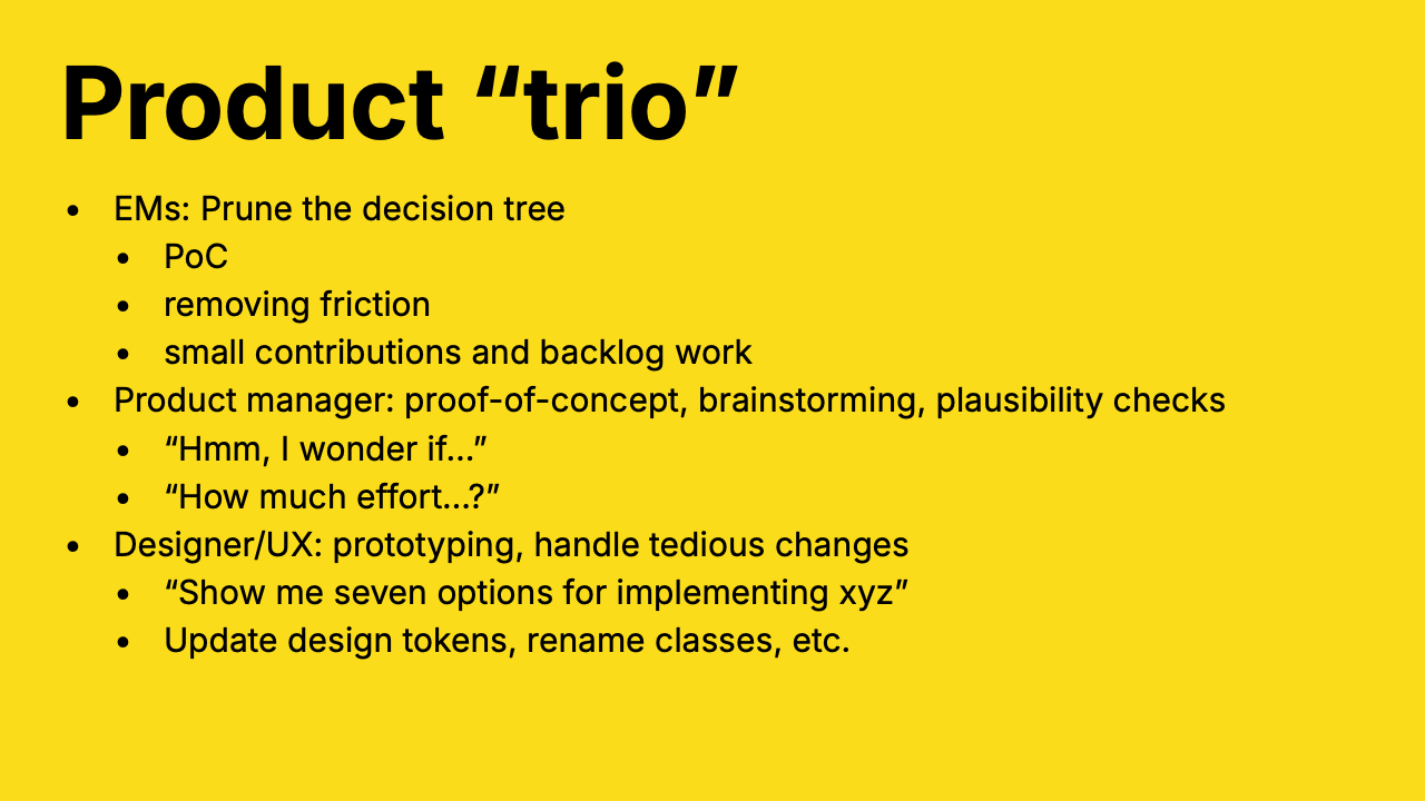 The whole product team can, and should, use coding agents. Leadership should consider updating how they work to include doing first-pass collaboration with coding agents to explore, develop, and validate their ideas.