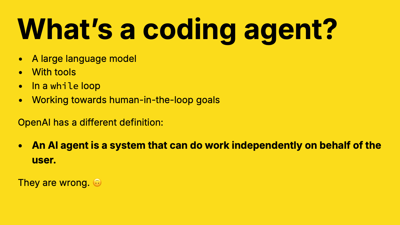 - Or, give the agent an exhaustive spec, often written with assistance from another “reasoning” model. Tell it to carefully implement one step at a time (lest they exceed their context window and go loopy).