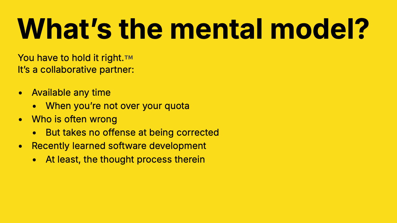 (Pardon me for engaging in a bit of anthropomorphism here. It is incorrect to think of LLMs, bags of floating points masquerading as a slot machine that impersonates a human, as teammates. But, we gender ships and point at little objects and say “look at that cute guy/gal” all the time, so I think there’s precedent in this way of relating to our inventions and environment.)