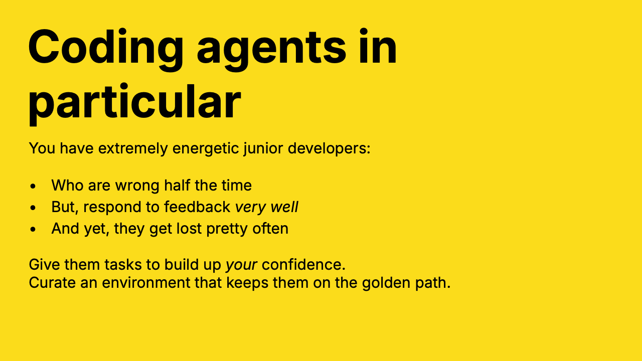 Give coding agents good goals (prompts), guidelines (CLAUDE/AGENTS.md), and tell them to use tools that keep them on the golden path.