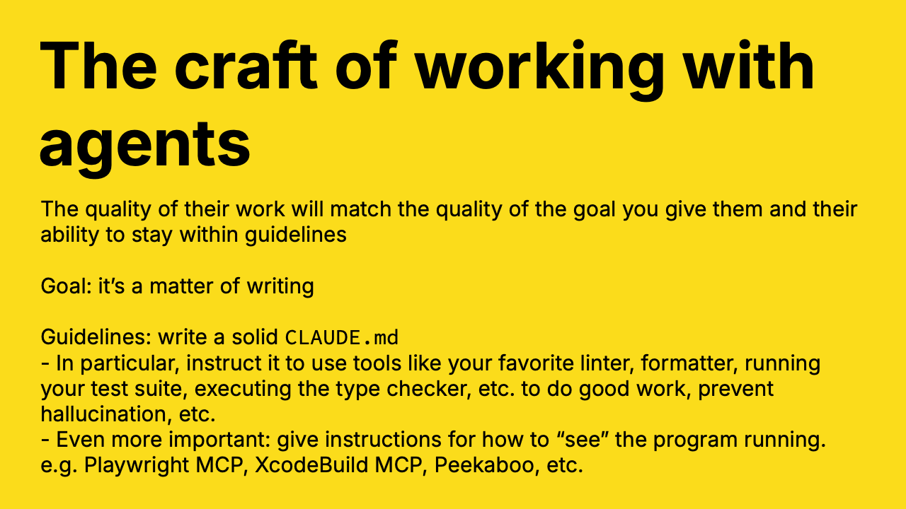 - Even more important: give instructions for how to “see” the program running. e.g. Playwright MCP, XcodeBuild MCP, Peekaboo, are important tools here. The longer an agent run its goal-seeking loop in its own, the better. The ability to run the program it’s working on and see if it achieved its goal, without human intervention, is where the uncanny magic really happens.