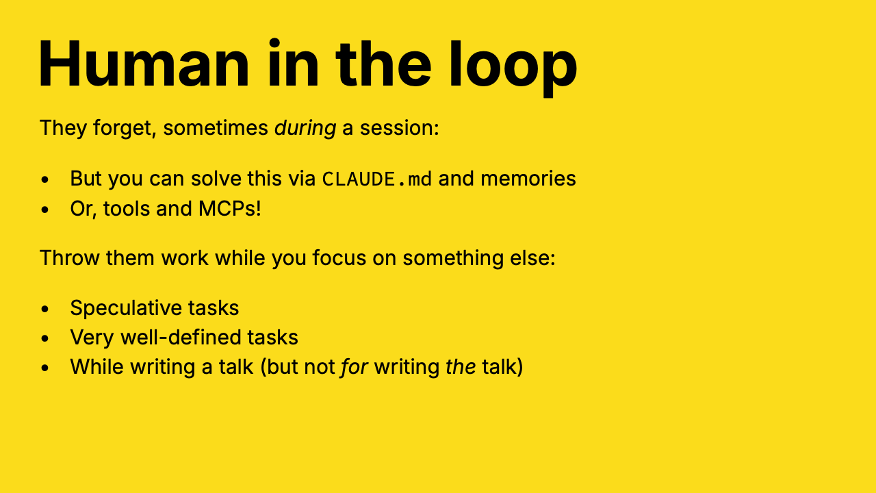 Agents forget, sometimes during a session. But you can solve this via CLAUDE.md and adding ‘memories’ to it. Or, tools and MCPs help too. There are even tools (like [bd]) to explicitly outboard the agent’s memory to task lists, not unlike a human might.