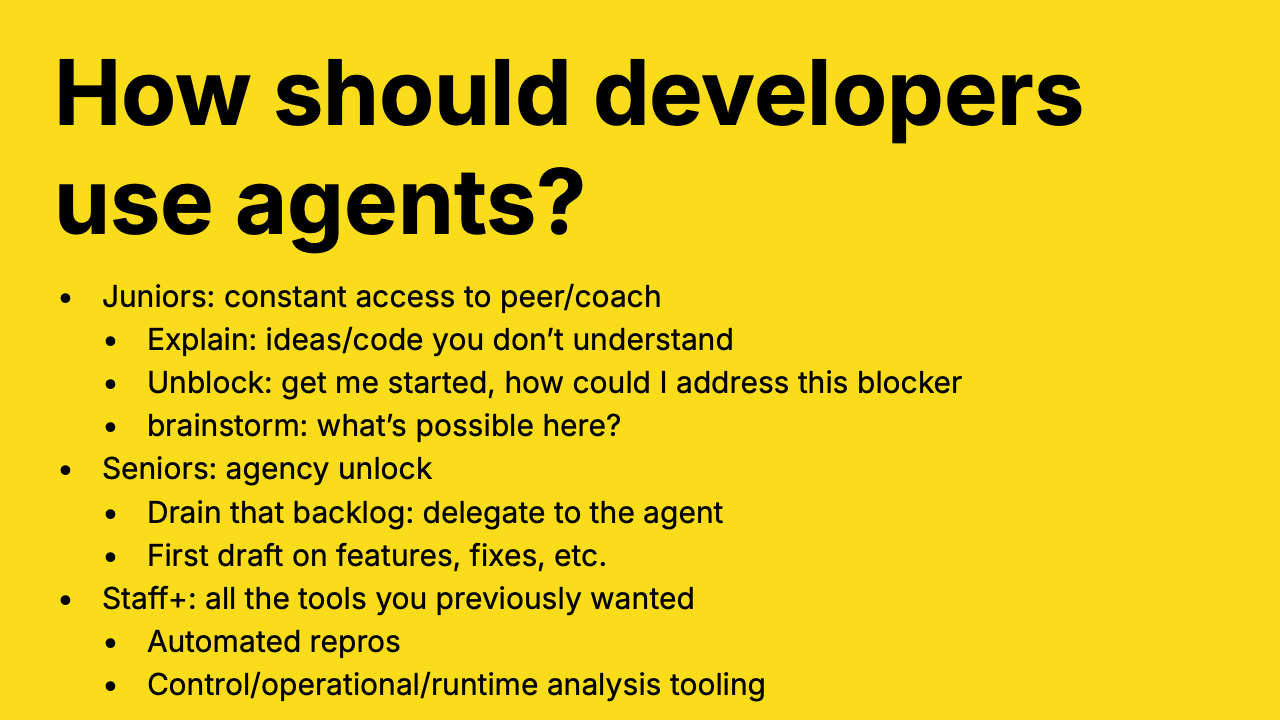 For staff+ developers, coding agents are an even bigger agency unlock. They can help you brainstorm or tackle automating reproduction of weird, hard to replicate issues. You can build the control, operational, or runtime analysis tooling you’ve always wanted. Again, think about, if the time to build throw-away tools, of increasing complexity, went to zero, what would you do different?